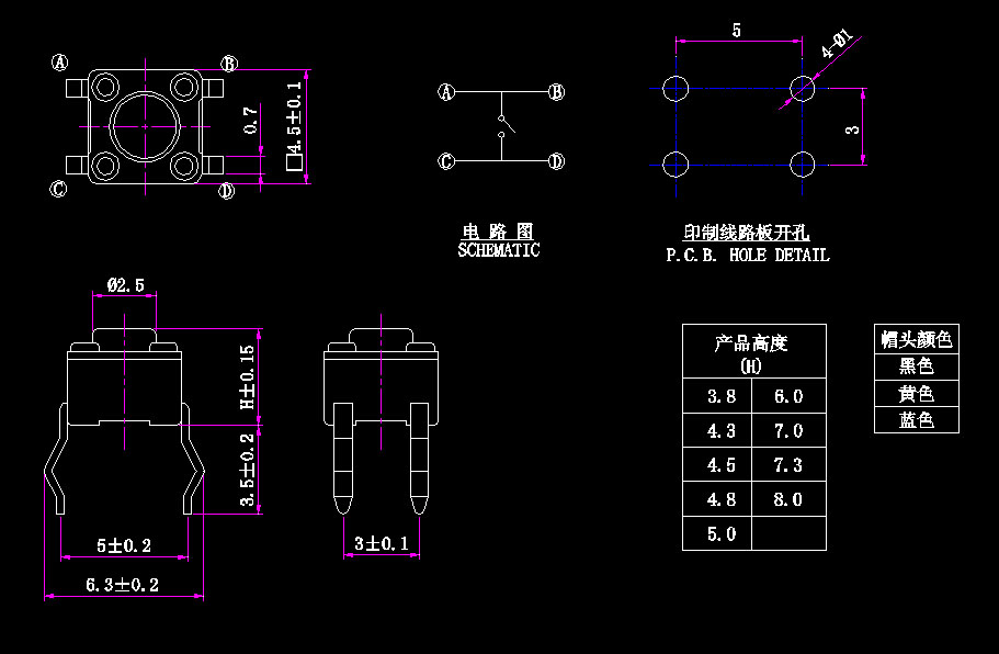 4.5*4.5系列開(kāi)關(guān),全規(guī)格,提供各種高度顏色選擇,應(yīng)用于實(shí)用電器,消費(fèi)類電子產(chǎn)品,部分型號(hào)防水防塵等級(jí)IP67、耐高溫產(chǎn)品可在苛刻條件下長(zhǎng)時(shí)間正常動(dòng)作,為客戶提供可靠保障!