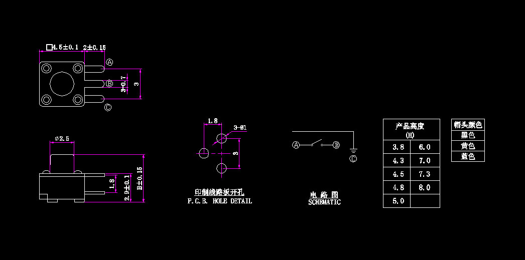 4.5*4.5系列開關,全規(guī)格,提供各種高度顏色選擇,應用于實用電器,消費類電子產(chǎn)品,部分型號防水防塵等級IP67、耐高溫產(chǎn)品可在苛刻條件下長時間正常動作,為客戶提供可靠保障!